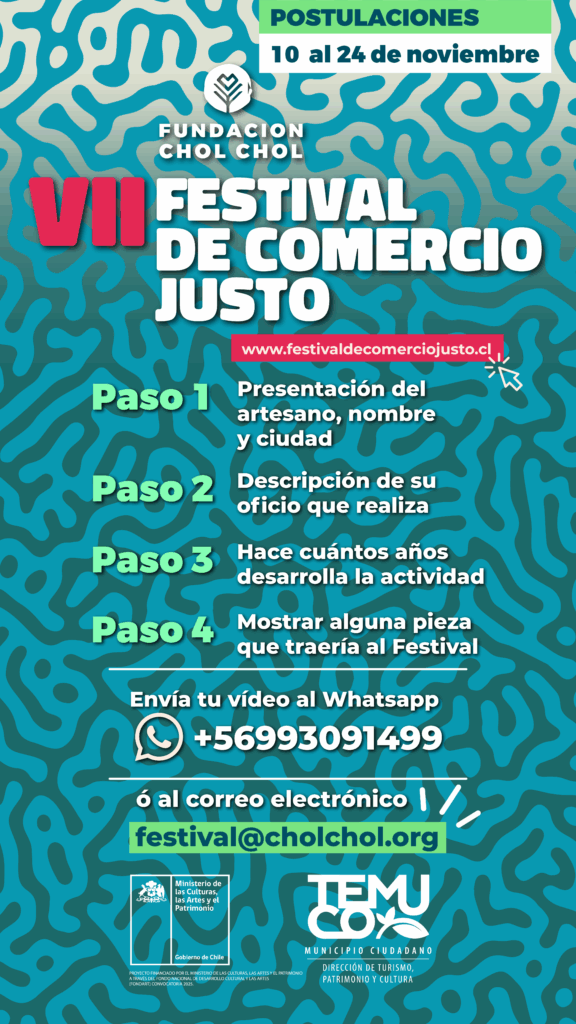 Las postulaciones se recibirán desde el 10 al 24 de Noviembre bajo dos plataformas disponibles a las 24 hrs. Al WhatsApp +569 93091499 ó al correo electronico festival@cholchol.org.